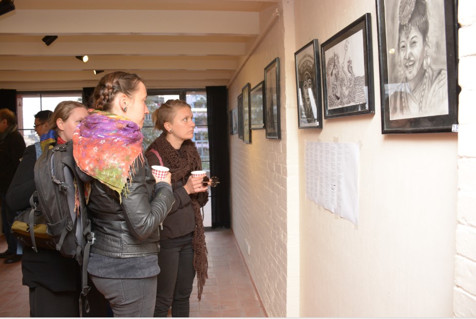 Then, we all moved inside the Taragaon Museum to see the main attraction: the art. The pieces on display were a cross-section of art of all sorts—painting, drawing, ink-work, and more. The Finnish embassy had provided the students with a great amount of material, both print and digital, which enabled the students to experience an immersion into Finland’s lifestyle, culture, and nature, which they then employed in the art pieces on display. The juxtaposition between what they saw and read and learned about such a far-off country, and their daily life in Nepal, make for some fascinating and truly original and beautiful art. I was particularly impressed by the nature pieces: wide winter landscapes and open expanses of water, birds familiar and foreign, and the many ways the students had tried to capture the beauty of the northern lights.