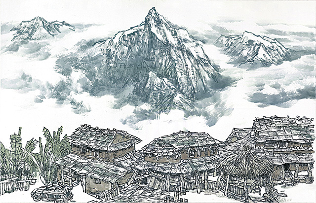 Not surprisingly, I found these “hip-and-gable” houses in Zhao Jianqiu’s ink drawings too. He too must have a fondness for them. There they are, distinctive but as familiar as a farm house; elegant, but not ashamed to be made of thatch and mud. See if you can find one in the great expanse of the Bhaktapur drawing. They star in “Passing by Pokhara” and take a bow in “Contented Life.”