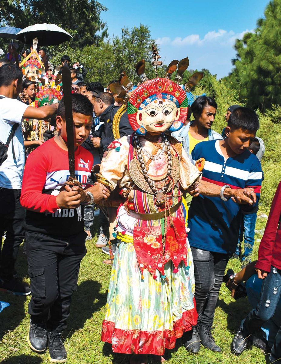 The sun was beating down on the hillock, and those who enacted the roles of various deities in colorful elaborately decorated outfits and different metal masks danced to the loud music of dhimay, a traditional drum, and jhyali, a folk percussion instrument.