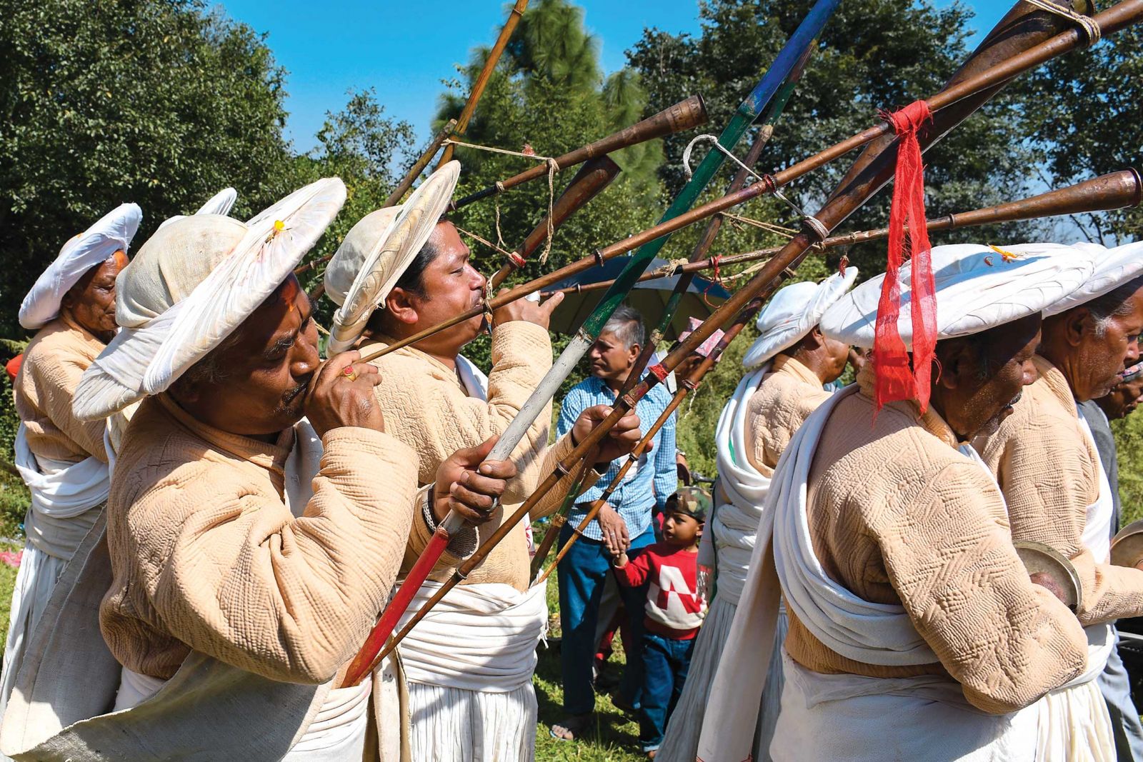 Bhairav, Mahankali, Indrayeni, Ganesh, Brahma, Vishnu, Shiva,and others. They were followed by other holy men in brown-colored costumes with white hats, playing payntah, a conventional long horn.