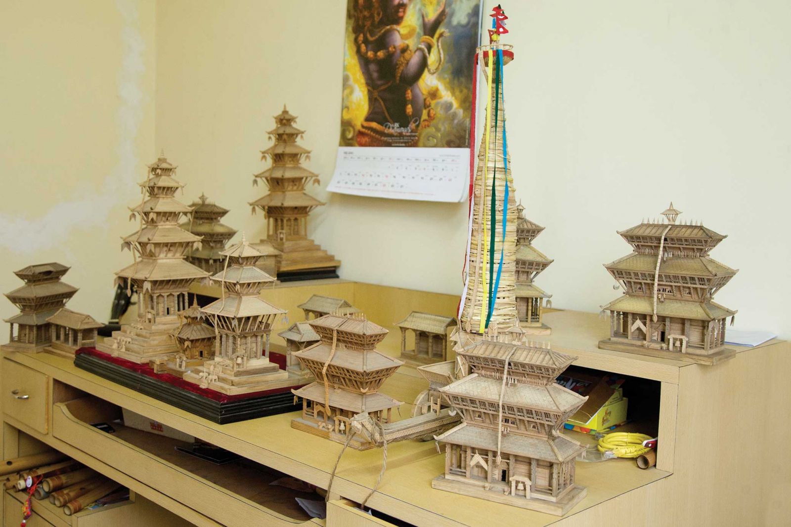 Bagh Bhairab is a famous temple revered by the people of Kirtipur. Hence, the Bagh Bhairab Temple's model is in huge demand amongst the people of Kirtipur. The people of Lalitpur prefer buying the Bunga Dyo replica, as the Bunga Dyo Jatra is the biggest festival in Lalitpur. Falchha is also another in-demand product. Falchha is an outdoor resting place, like a patio. His other available models are Uma Maheshwor Temple, Pashupati Temple, and Nyatapola Temple of Bhaktapur. He is planning on making a replica of Kumari's chariot, as well. He also plans to make a Newa chhen (traditional Newar house) model in the future, because his clients are mostly Newars.