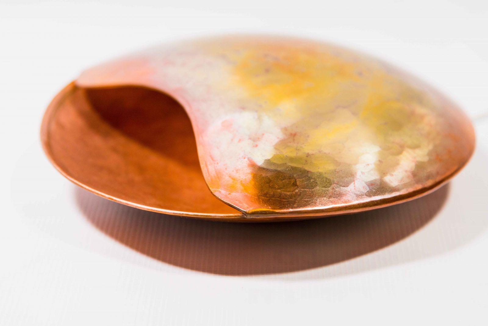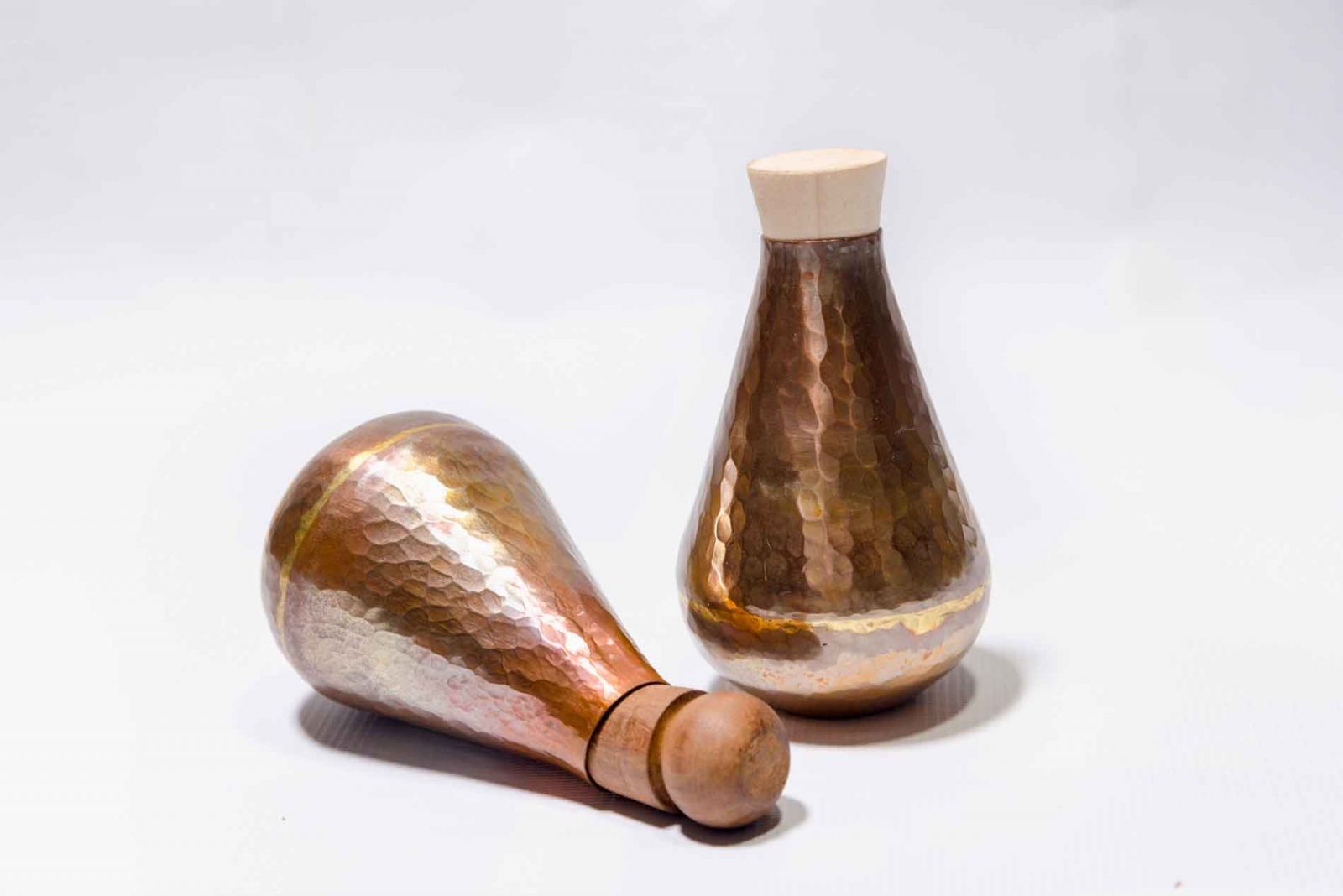 While there is the above-mentioned variety of materials in use, copper is clearly a big part of what Pia does, and they aim to find and utilize different techniques to present it. Here, there are bottles, trays, and plates in different colors of copper, some of which are beautifully oxidized.