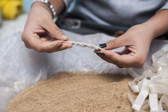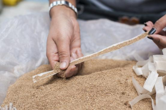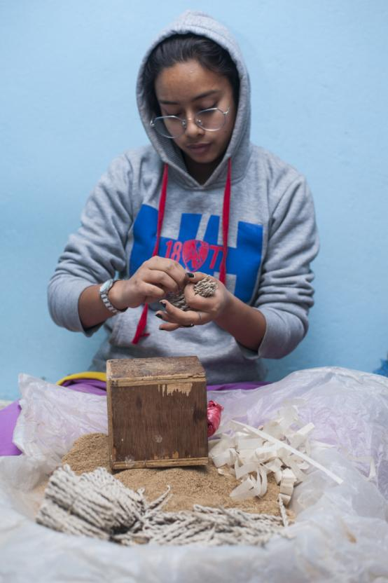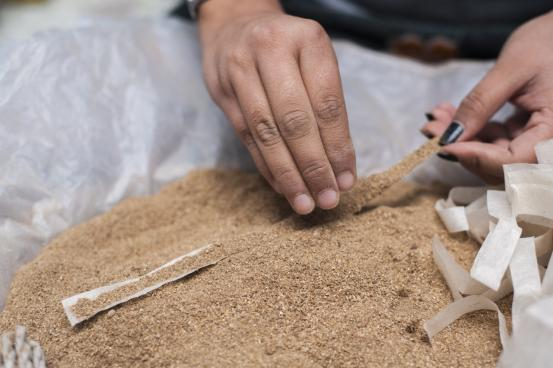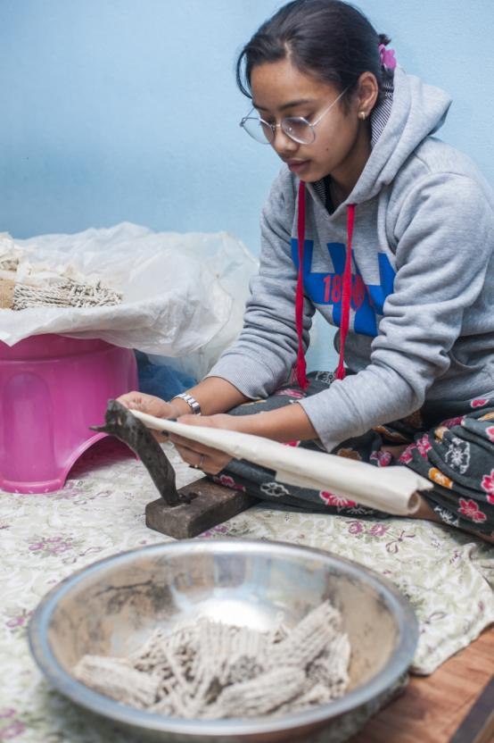 “My mother, Maha Laxmi Shrestha makes about 100 packets of incense per day. I help her on days when we have more orders than usual. Personally, the aromas make me feel at peace and the making process itself is like a meditation.”, says Mallika Shrestha, a resident in Thimi. The act of burning incense has been a traditional worshiping ritual in Nepal since ancient times. It is believed to be a soothing medium of purifying space and inducing positive vibrations to the mind. One form, bateko dhup possesses Astasugandha, eight burning fragrant ingredients which includes Sal dhoop, camphor, kasturi (musk), chandan and srikhanda. The mixture is grounded into fine powder and then, rolled into lokta paper by hand to form a coiled rope shape.