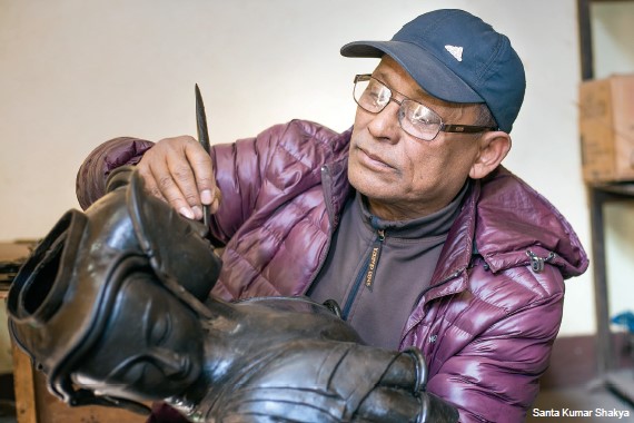 The above-mentioned examples should put to rest any doubt about Okubahal being a mine of metal sculptors. Yet, it would be negligent of this writer not to mention one more, that is, Kalu Kumale, who was born in Tha:pa of Okubahal to a family of traditional potters, but moved on to become one of the country’s greatest living metal sculptors. He is an octogenarian now, and his workshop is in Haatiban, and he is known famously as the “Angry Sculptor” due to his depictions of Megha Sambhar, a ferocious guardian deity having the head of a buffalo. His honorific title is in complete contrast with his deep humility and soft spoken personality. Not so his works: they are huge, and fairly shout out their imposing presence wherever they may be.