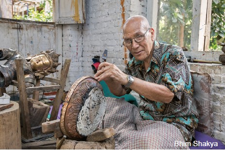 It is also in Patan that you’ll find Bhim Shakya, who lives in, yes, the very same Okubahal, that haven of metal sculptors. He is well past eighty, but still carries on doing what he knows best, in fact, is a master of—chiseling—an art that requires deep knowledge of iconography, and a hand that is as sure as a brain surgeon’s. One of his best works is a beautiful 15-inch figure of Padmasmbhava that was on display at a traditional art exhibition some years ago at the National Art Council. Colorfully rendered, the engravings are extremely well detailed, and one cannot but admire the painstaking work of chiseling that has gone into it. He has had a colorful life, as well. When 15, he took off for Lhasa, where he lived for eight years, becoming a monk in a gumba and learning about Tibetan Buddhism. A three-foot-tall stupa in Maitri Gumba of Swayambhu is one of his more conspicuous works, its size being also somewhat away from the norm, since it is the smaller figures that are more challenging to bring to life through the fine art of chiseling, and in which he clearly excels.