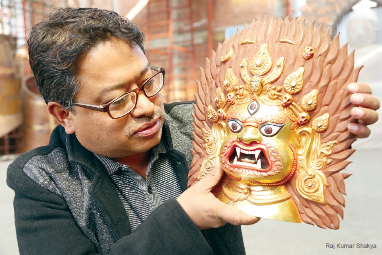 However, when talking about large statues, one cannot top the achievements of Raj Kumar Shakya, another prominent metal sculptor of Okubahal, who recently shifted his workshop to Haatiban because of the damages to his ancestral home by the 2015 quake. He specializes in metal sheet embossing and making large-sized statues, as well as stupas, mandalas, and temples. He, or rather, one of his works, was in the limelight recently—a 155-ft-tall statue of Guru Padmasambhava in the eastern part of Bhutan, which was completed in March 20, 2014. It consists of 40-ft high pedestal, and the face alone is 15 ft in length. A total of 70,000 kg of copper was used in its making. Another of the master’s notable works is a 16-ft Bhumisparsha Buddha in Lumbini, and presently he is busy on another massive work, a 50-ft Siddhartha Buddha that will adorn the Ling Sang Temple, also in Lumbini. Raj Kumar was responsible for all the repousse work done in the Nepal pavilions at the World Expos in Hanover in 2000 and Shanghai in 2010. He is also a recipient of the “Best Artist of the Year” award by FHAN.