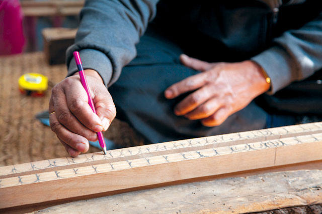 On my second visit, I met Raj Man Bajracharya, from the Federation of Handicraft Associations of Nepal, who are partnering with the Kathmandu Metropolitan City on this project. He told me that they were able to tap into their database of craftsmen of all sorts to find specialists for this project. Most of them are Newars, and to my surprise, one is even a woman. The atmosphere is busier when I am here this time, with everyone hard at work on the job at hand. Less time to talk, but I don’t mind—there’s more opportunity for me to observe and learn. One man is sketching designs onto pieces of wood with a pencil: someone else is mixing sawdust and glue to make a filler for cracks in an old carving. Yet another craftsman has set out to repair a large, bite size hole in what is otherwise a beautiful strip of carving: a new piece of wood has been fitted into the gap, and he is now painstakingly carving the new part to match the old design on either side of the new insert.