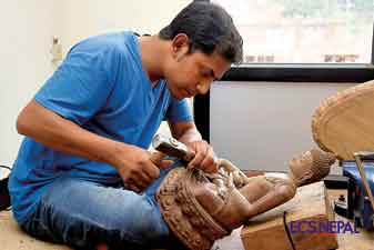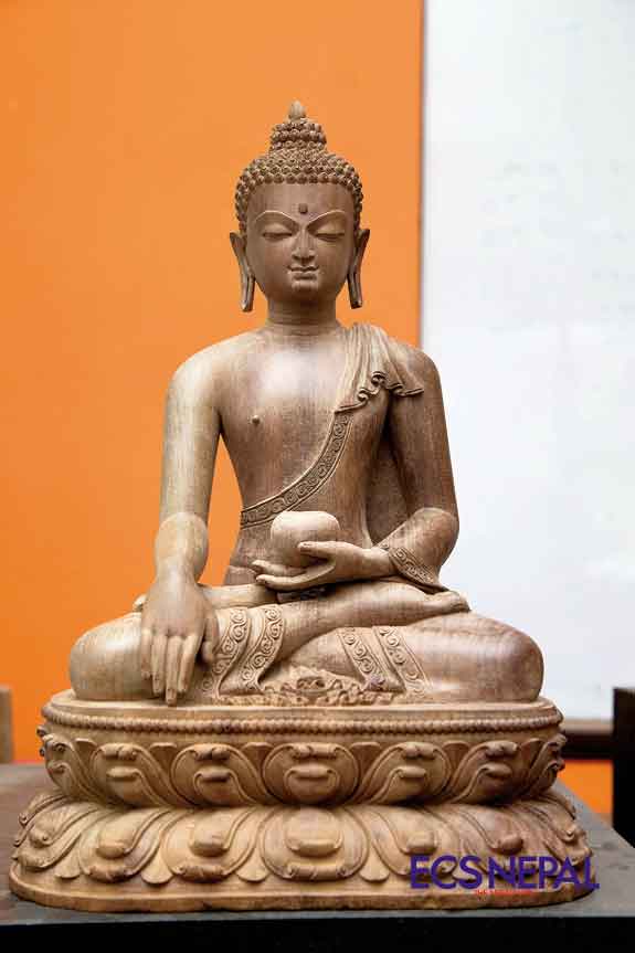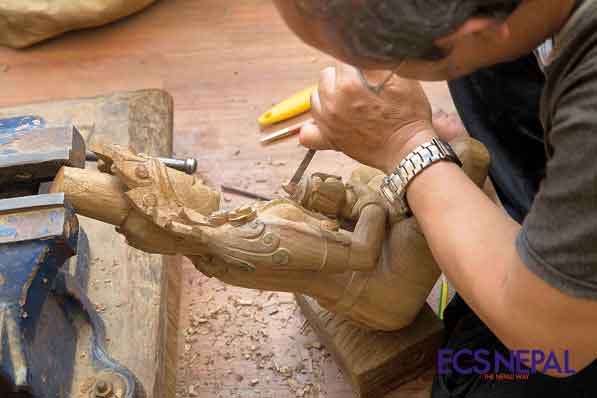 Often ignored when mentioning our rich culture represented through traditional art, I first came across the beautiful craftsmanship of Nepali woodcraft when visiting a small exhibition in Patan Durbar Square. Walking into the exhibition, my eyes fall instantly on a wooden marvel, a sculpture of Aparmita. A beautiful wooden piece with a smooth finish, and extremely detailed, truly capturing the essence of the holy goddess it portrays. Now, what fascinated me the most when I saw these sculptures was the fact that each sculpture was made out of a single block of wood. The mastermind behind these beautiful works is Laxman Maharjan Tuladhar, a man who has dedicated his entire life to this art form.