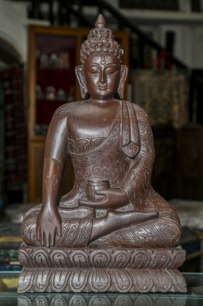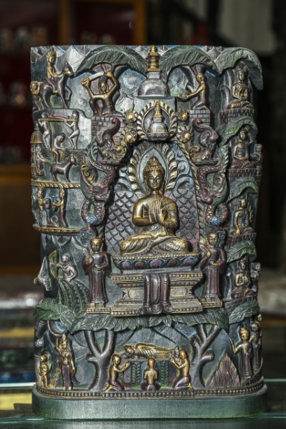 Currently, they have fifteen artisans working for them. They even provide training in their workshop, which also has a seasoning plant. The moisture content in the wood is soaked up and dehumidified there. This process creates durable wood that is less likely to bend or crack easily. Most of their works are traditional, but they have experimented with different styles and unconventional themes as per the demands of customers. They have fused metal and glass elements to wood. Sometimes, they also borrow from European designs. This, according to his experience, yields better sales. They have a large showroom with outstanding woodworks inside the Patan Industrial Estate. It has idols of Hindu gods, mandalas, wooden furniture, carved doors, the traditional Newari-style lattice windows, and many more. Some of their works have mythical tales marvelously carved in them in the form of pictorials. Their showroom is a must-visit for every Nepali woodcraft enthusiast. They have both variety and innovation in their pieces, and even customize customers’ commissions on request.