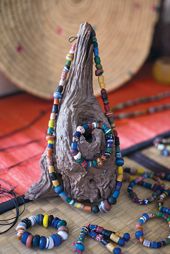 To produce the beads, glass is crushed with mortar and pestle, and run through a sieve where powder is accumulated. This very fine glass powder is used for painting designs, while the chunkier pieces make up the bead itself. The powder is poured into molds made out of China clay-coated mud. Twigs cut into small pieces create the bead’s holes. Placed in the center of each bead, the twigs burn when the molds are positioned into the mud kiln for firing, leaving a hole behind.