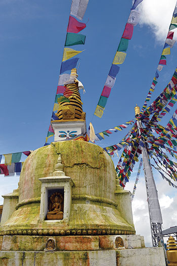 During winter the trail, lined with dense forest, will be covered with thick fogs, limiting your vision to four feet. A little more than halfway up the trail, you will reach a grassy clearing that offers spectacular views of the forest and hills around. At Jamacho Stupa (2,128 m), you will be greeted by the sight of monks praying, the smell of incense, and the fluttering of prayer flags. In the wintery mornings, you might not be able to see the northern Himalayan range so well. But when the clouds disperse, the beautiful vistas of Manaslu, Langtang, Dorje Lakpa, and Ganesh slowly emerge on the skyline.