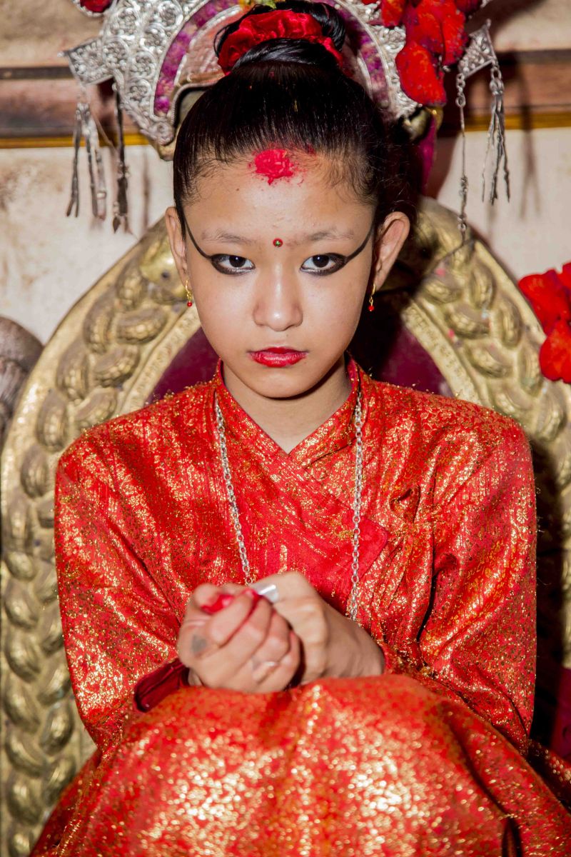 Then, she led me inside, and offered me some water from a small copper vessel, with which I washed my hands, a purifying gesture. It was a big room, comparatively, and at the far end sat a small girl in a high backed chair. She was pretty, perhaps eight or nine years old. Her kohl-lined eyes looked upon me; there was serenity in them, and she was dressed resplendently in a bright red sari with a gold blouse. Her hair was piled up high in a bun. I may have missed it, but I think there was a gold tiara or something like it on her hair. Her face was made up carefully. She was an inspiring sight.