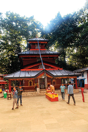 Just before you reach the temple complex, you will see nine beautiful miniature stone statues and beneath them, nine stone spouts. Sadly, there’s only a tiny flow of water from them. The multi-roofed temple is surrounded by tall sal trees swaying gently in the breeze, and walking around the area is pleasant and refreshing, especially in the early morning. According to a legend, the King of Parbat, Pratapi Narayan, received an idol of the Goddess Kali (Kalika) as dowry from Palpa's King Manimukunda Sen when he married his daughter in the 1500s. While returning to Parbat from Palpa, the King and the rest of the wedding procession spent the night in the forest. The next morning the idol of the goddess couldn’t be moved so the King decided to built the temple in that very place.