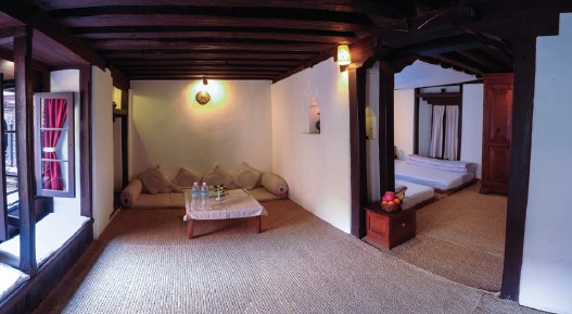And the reason behind that is what it offers, a chance to experience the old, ancient culture and heritage first hand. The old house seems as if it has been untouched throughout these centuries, Small doors, wooden décor with intricate carvings and those aakhijhyals. Even the furniture makes use of woven mats, made out of coir, or sukuls and gundri. There are 8 rooms here, each of which are named after the eight auspicious signs of the Asthamangal. There's also a gallery that promotes local talent, with works available for purchase if you like. You can also enjoy your free time in a mini-library that resembles a pati. All in all, what you get here is a quality experience. pleasing both for the eyes and your soul.