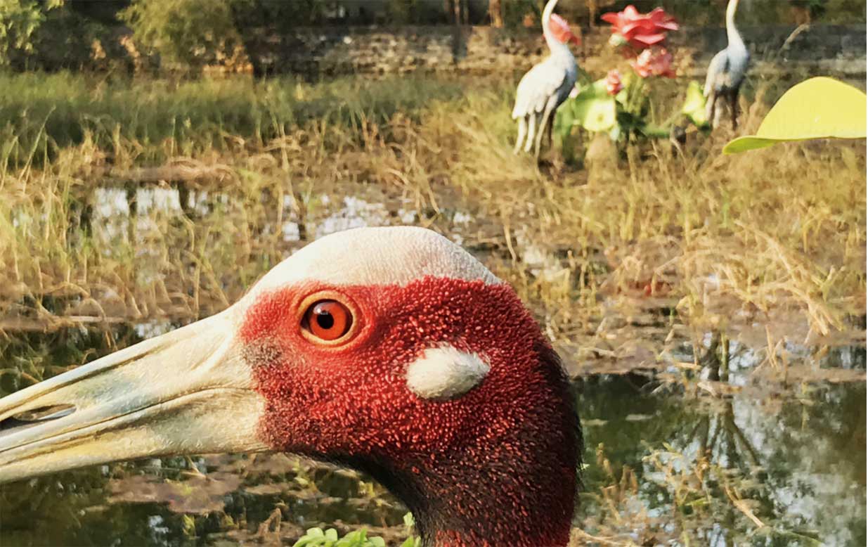 Dharmendra told me the story of the Sarus crane intertwining with that of the Buddha. It is said that the young Siddhartha Gautama and his cousin Devadatta were exploring the gardens behind the palace when a large, low-flying crane caught their attention. When Devadatta shot the bird with an arrow, it took refuge by the young Buddha-to-be, who calmed the bird by tending to the wound. Devadatta argued with his cousin, saying the bird belonged to him, because he had the right to hunt it. Siddhartha refused, saying that because the bird had not yet died and was seeking protection, it was his right to take care of it.