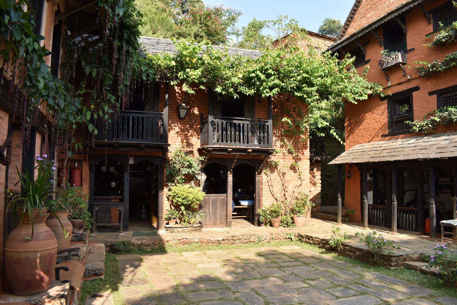 The Famous Farm is a collection of Newari-style buildings, some old and some more recently built in the traditional style; the land terraces down several levels, and is filled with trees, flowers, and—as befits a farm—animals. The most noticeable were the turkeys, shameless attention seekers who strutted around as if they knew their job was to add to the atmosphere. Meals were served outside, blooms spilled over doorways, and the whole effect was just delightful. Usually, hotel rooms are pretty stereotypical, but nothing could be farther from that here; a great deal of thought had been put into the décor and furniture, and it really made a difference. Traditional clay floors, old-style wooden doors and windows, all a really surprising combination of rustic and chic. I slept well, not a given when I’m away from home, and just felt completely cozy and homey while there. If you’re looking for a short getaway destination, I couldn’t recommend it more highly.