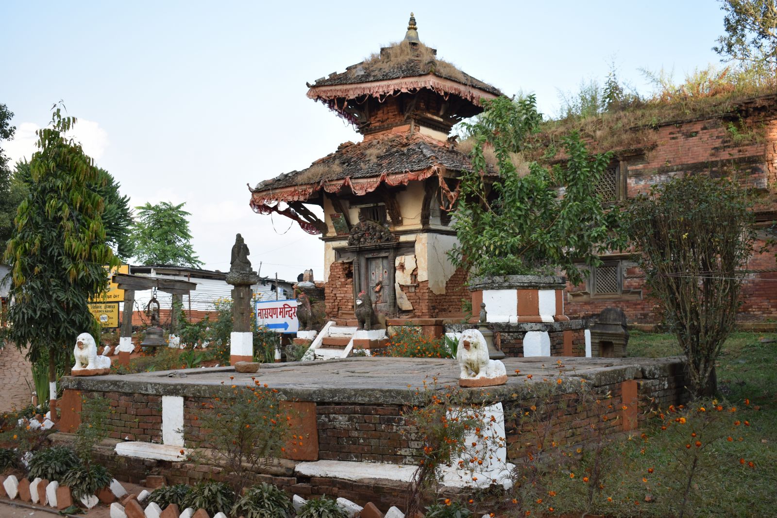 Leaving the Durbar Square, I walked through another short stretch of town to the ridge’s edge, where several more historic temples are located, as well as a very attractive pati (community seating area). The temples at this end seemed worse off than the palace area, but it was still possible to get a glimpse of what must once have been. Here also there is scaffolding and signs of rebuilding, particularly around the Bhairav Mandir.