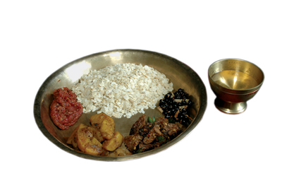 A typical day for the Newar begins with the kaula, which is breakfast made of sweets, puri, halwa, jerri (jilebi), even gwaramari. The main meal in the morning is the jyona and in the late afternoon we have baji with vegetables and meat. Besides the normal day, there are six to ten major feasts (bhoye) that the Newars host – the variety of food items is great and boiled rice is replaced by baji. The Newars take great pride in serving the biggest variety of meat dishes that come from just about every part of the water buffalo. The evening meal is the beli consisting of rice, lentils, a variety of vegetables, pickles and yes, buffalo meat.