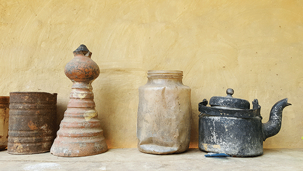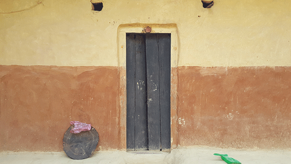 Although Gyani Maiya has built a new concrete house, the old mud house where she spent most of her time still looked more beautiful than the new house. Painted with yellow and red clay, the house with a simple wooden door had a row of daily use items like an aluminium kettle, a clay kerosene lamp, and some plastic and tin containers lined up by its side. Despite looking archaic they were still used regularly by Gyani Maiya’s family.