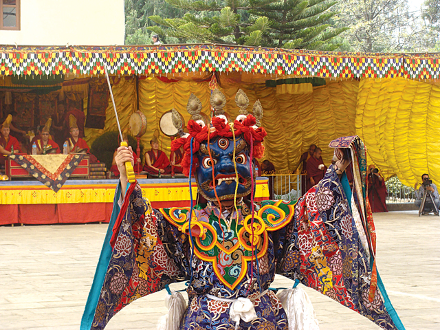 The Tsechu Cham is a choreographed retelling of Guru Rinpoche’s exploits in his eight different manifestations. It started in the twelfth century after Guru Chowang had a vision in which he traveled to Guru Rinpoche’s heavenly abode, where he witnessed a performance of the dance. Perhaps it is this ancient and spiritual aspect that makes it a profoundly moving experience for those who see it. Khyenpo Gyurme says the dance has a religious and cultural importance. “Buddhists believe that witnessing such events earns one spiritual merit. Its cultural importance is that it brings people together. In remote regions, where social gatherings are rare, festivals such as these provide the people with an opportunity to meet and celebrate.”