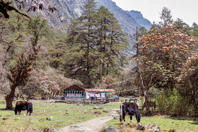 The air is cool, but sweet. Far from any motorized noises, it trills occasionally with the sound of birds, and gurgles constantly with the ever-present rhythm of the nearby river. The water is glacial, shallow, and bright, and my friend Ngaire and I are walking a pine-forested path that mimics its form. Around us, rhododendrons are bright with the flush of spring, thick moss clings to rock, and we catch glimpses of tiny squirrels. It is peaceful, but unlike the mythical Shangri-la, this is a real Himalayan utopia. This is Langtang.