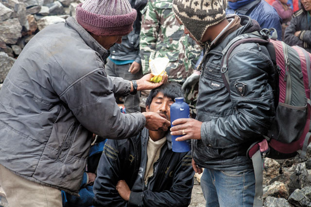 On the flats above the hilly ridge over Langtang village stands a low building, near completion. Built to serve as a new hospital for the valley, the shockwave from the fall over Langtang has shredded the roof and ceiling from the otherwise solid structure. It will be our sanctuary until rescue. Upon arrival, my heart soars; there is our British mate Mick and his Taiwanese friends. They were first on the scene, and by the time we arrived hours later, there are several fires and some rough shelter. The building is swamped with survivors. The horror on the faces of the Langtangpas scars me to the core. ‘Have you been to the ridge?’ Mick asks. ‘You’re not going to believe it.’