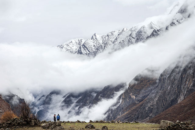 The path down the valley is indistinguishably treacherous and changed, covered in rocks and snow. The mani stones have slipped and tumbled. People begin to pass us, heading up to Kyanjin, and their words distress the Nepalis. ‘Langtang is gone’, they translate. We think they mean ‘gone’ like Kyanjin; bruised, but certainly not broken. Certainly not wiped from the map. Of course, we have no way of knowing how wrong we are.