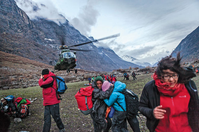 Ngaire and I are on the second flight out from New Hospital, crammed in like grateful sardines with the rest of the women and the first of the men. The helicopter, it’s like sitting in an enormous washing machine, shaking and roaring. After initial cheers as the doors close behind us, the faces around me are pale, people are crying. The men left on the ground are waving up at us as we take off. We see the New Hospital from above, and the salvation of those solid walls seems so small, before we are swept up above the destruction. Beyond Langtang village, forests are flattened, the river itself has changed course, and there are many landslides. The horrified silence in the helicopter is swallowed by the strong and steady chug of the MI8 taking us away from a place which is destined to stay with us forever.