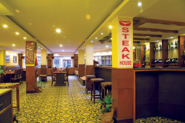Kathmandu Steak House: Steak is known to be an almost everyday choice of food for those in the West, just like we have our daal-bhaat. To bring more choice and ignite the foodie version of us that we’ve managed to tuck away, Kathmandu Steak House provides excellent steaks for all meat lovers. Located on the first floor of Hotel Trekkers’ Home, Kathmandu Steak House should be your next stop if you are in the mood for some juicy, grilled steak. Although their main dish is steak, the interior is nowhere near a typical American style inspired restaurant. The atmosphere almost looks like a fine dining place, with long tables that are placed from one part of the room to another. The restaurant is generously spacious, providing large amount of natural sunlight in.