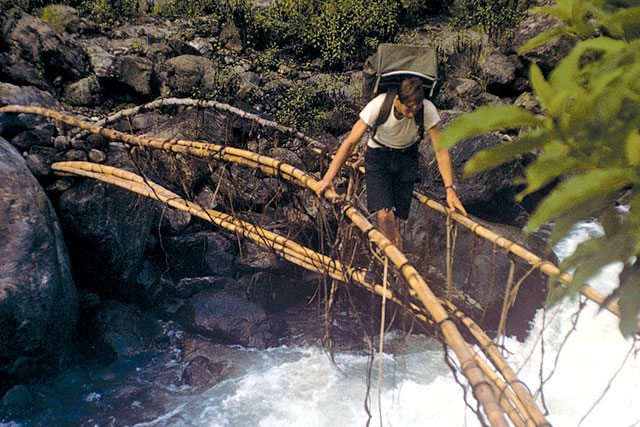 And sometimes not, for he also wrote that on trails “slimy, slippery and half overgrown after months of rain” the Vibrams may present “the unwary with many opportunities for misadventure.” They were most dangerous, he discovered, when crossing ‘parris’ clinging precariously to canyon walls along roaring rivers. ‘Parris’, which are not much seen any more, were made of narrow planks, poles or tree limbs laid across posts driven straight into cracks on a cliff wall, or held up from below by tall poles well anchored. The cautious traveler used them to traverse a river gorge directly, rather than clambering up and down, far and high to avoid the cliffs. Some ‘parris’ he encountered were “greasy enough to warrant the strewing of a little sand for those misguided enough to wear rubber-soled boots.” Very slippery. Very dangerous. Very scary.