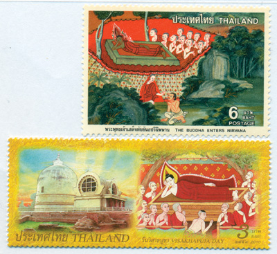 Buddha continued his teaching of the Dharma into his eightieth year. After being seriously ill he paused to rest in a sal tree grove in Kushinara. As shown on the Thai stamp he lay down on his right side between two sal trees, his head facing north. Buddha then announced that he would enter parinirvana. The death of the Buddha took place on the full moon day of Baisakh (as did his birth and awakening).