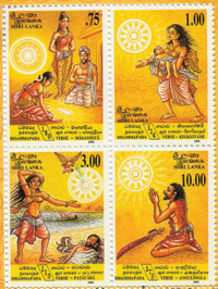 Dhammapada is one of the best-known books of the Pitaka. It is a collection of the teachings of the Buddha. Four important stories from the Dhammapada are pictured in the Sri Lankan stamps.