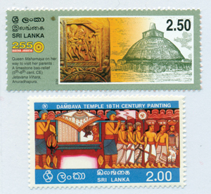 The Indian stamp shows the Ramabhar Stupa in Kushinagar that marks the actual cremation site of the Buddha. The wall painting from Samudragiri Vihar in Mirissa shows the cremation pyre of the Buddha.