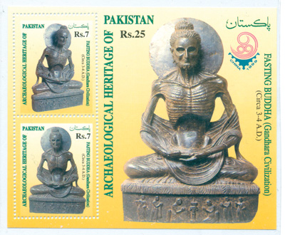 Siddhatha together with five other ascetics namely Kaundinya,Vaspa, Bhadrika, Mahanaman and Asvajit, practiced a harsh regimen of meditation for six years and this is depicted in a stone statue from Gandhara on the stamps from Pakistan. His sun-baked body is reduced to skin and bones with deep hollows under the eyes and brought Siddhartha near death from starvation.