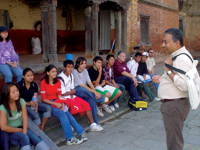 Next morning it was off to the sacred forest of Bajrabarahi and Nag Daha to understand the link between ancient cities and the surrounding natural resources. The forest, water resource and agricultural land have nurtured these cities for ages and they are currently under pressure from rapid urbanization. Loss of Guthi land that paid for the maintenance of most of the monuments and other structures, which are part of our cultural heritage, is a concern for all. Following the course of the water into the city, the entire team then picked up brooms, shovels, brushes and washed the stone water fountain at Saugal Hiti in Patan and made it “as good as new”. Yogendra Kayastha and Prakash Amatya helped us understand the link between natural resources and the city. The purpose of the evening walk was to see the various wells and stone water spouts of Patan and to understand the community’s efforts at conservation.
