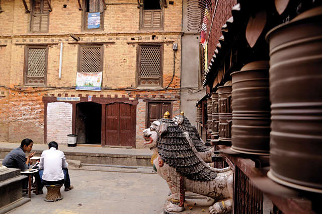 There is no family yard here that is not also a common space. It’s, at the same time, a quiet private refuge from the streets outside, a busy workshop, a play space for children and a walkway for those who know the way. And it’s always, also, a sacred space: a shrine to the Reclining Buddha in the first square, the Mother Goddess in the second one, and here in the third is a 17th century shrine to Buddha. From here you can continue through three more squares – all of them the traditional homes of woodcarvers – where greenery spreads across the brickwork and birds chirp around sacred chaityas, creating a series of quiet oases from the maddening traffic on the other side of the solid-walled homes, only a few score feet but a world away.