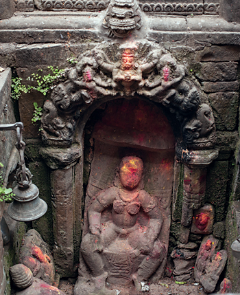 There aren’t many scholars in Nepal equipped to identify her age, but there are a few, such as Devendra Nath Tiwari, director of the Patan Museum, and archeology and monument expert Kumar Rajbanshi. They agree that this statue – unmarked and unlisted in guidebooks– is one of the Valley’s oldest. It’s impossible to say for sure how the inhabitants of this area in Kirat times saw her, over a thousand years before the sweetmakers and woodcarvers moved in. But later arrivals continued to venerate her as Harati, a Buddhist protector-goddess of children also known to Newars as Ajima, or grandmother goddess. That’s how the residents of the square see her today. Her features have been worn by the pouring of water, sprinkling of powder, and the passing of two millennia, but she’s still here.