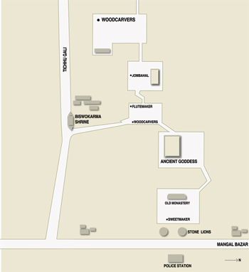 In this second square, woodcarvers ply their craft in the sun, seated on the ground by a sunken shrine surrounded by candleholders. The shrine is four feet below the courtyard and houses a weathered goddess. An old plaque in Nepali gives a recent date; but that refers to the surrounding framework created by a reverential patron.