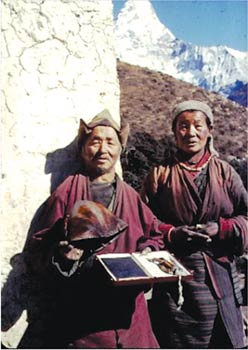 In nearby Khumjung we visited the aging Kapa Kalden, a noted Sherpa artist, and his (then) young son, Pasang. As a ‘kapa’ (artist), Kalden deviated slightly from the traditional Tibetan style of religious painting to illustrate common village and mountain scenes with sacred overtones. While he lived, his unique landscapes avidly bought up by early foreign visitors to the Khumbu. Today, they are collectors’ items.