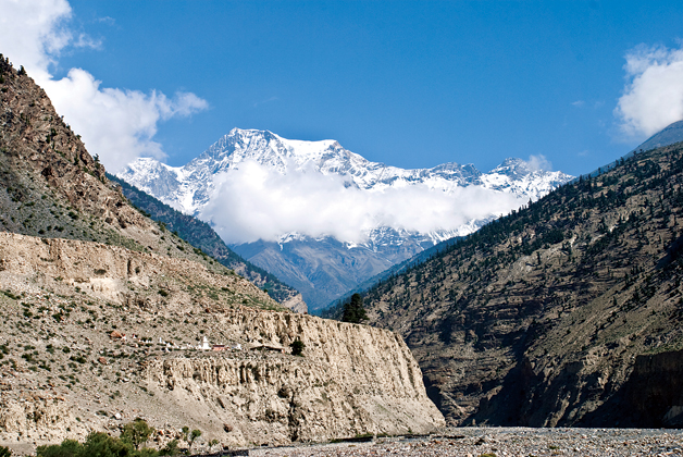 (hot water), famous for its hot springs and delightful lodges with an abundance of fresh fruits and vegetables. The trail then climbs steeply to eventually reach the villages of Lete and Kalopani. These villages have delightful lodges and a superb mountain panorama with views of both the Dhaulagiri and Annapurna Himals. The villages of Kobang and Larjung offer stupendous foreshortened views of the Dhaulagiri massif. Due to the greater heating of the air above the Tibetan plateau, a fierce wind roars along the valley every afternoon. Houses in this region have small windows and huddle behind rocks and other features as protection against the fierce wind.