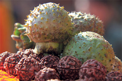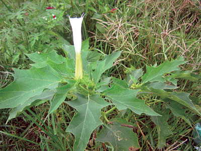With the help of a friend I began to search for this mysterious and dangerous plant in Kathmandu. Almost immediately we found copious amounts of large plants growing along the banks of the Bagmati bearing both the trumpet-like white flowers and the distinctive seed pods which have led to Datura being known as the thornapple in English and other European languages. We picked several seed pods for further identification at home using the internet. Our conclusion was that what we had in fact found was Datura stramonium, not Datura metel whose seed pods are noticeably rounder rather than egg shaped. In any case, all species of Datura contain scopolamine and are therefore likely to be used indiscriminately for magico-religious purposes.