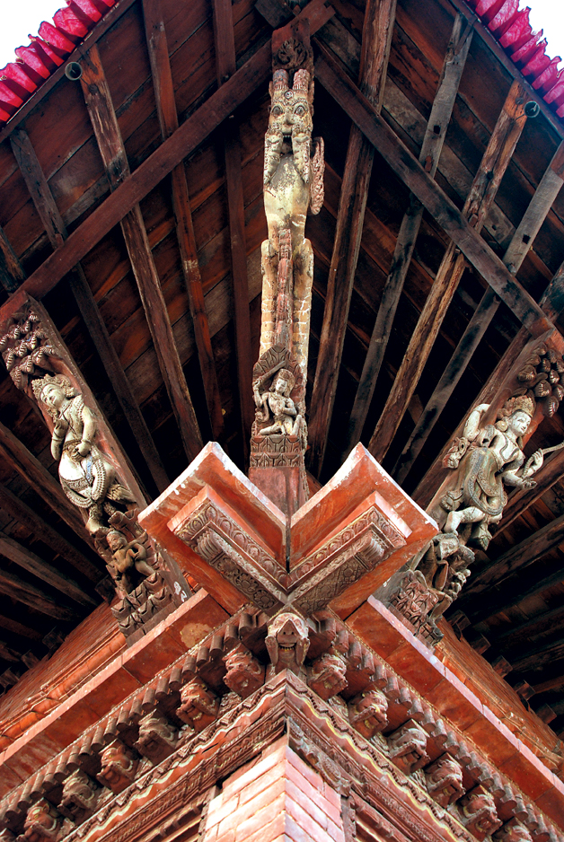 Timber was liberally used to make pillars, beams, brackets, struts, doors and windows, roofing, etc. Sal timber (Shorea robusta) was traditionally used for most structures and decorative purposes although there is evidence that pine wood was also used for making rafters. Timber pegs and lap joints (chukul) were used to connect the different timber frame constructions like the wall plates, corner posts and rafters. And of course, one mustn’t forget that it is the intricate woodwork that really distinguishes Newari architecture from the rest. Temples with circumambulatory paths have isolated wooden columns on the outer side that can be either single rowed or doubled rowed depending on the temple’s size. Usually, these columns are supported by dressed natural stone (ilohan) or a wooden threshold. The wooden columns support a wooden bracket, which transfers the load from the lintel and beam to the column. The columns are joined to the beams by thick wooden struts at their upper extremities and the single length beam normally extends beyond the angled columns with the extremities often carved into dragon’s heads.