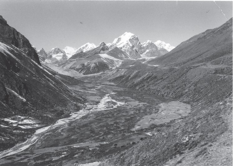 New, metal-roofed lodges can be seen in this 2007 photograph of Pheriche even from a distance. The river channel has expanded considerably, probably the result of glacier fl oods from the Khumbu glacier in 2002 and 2007, resulting in the loss of grazing lands. One of these floods destroyed the new concrete and steel bridge that the Khumbu Alpine Conservation Council (KACC) had built in 2006, but was replaced shortly afterwards. Note the loss of ice on the background peaks (photograph by A. Byers).