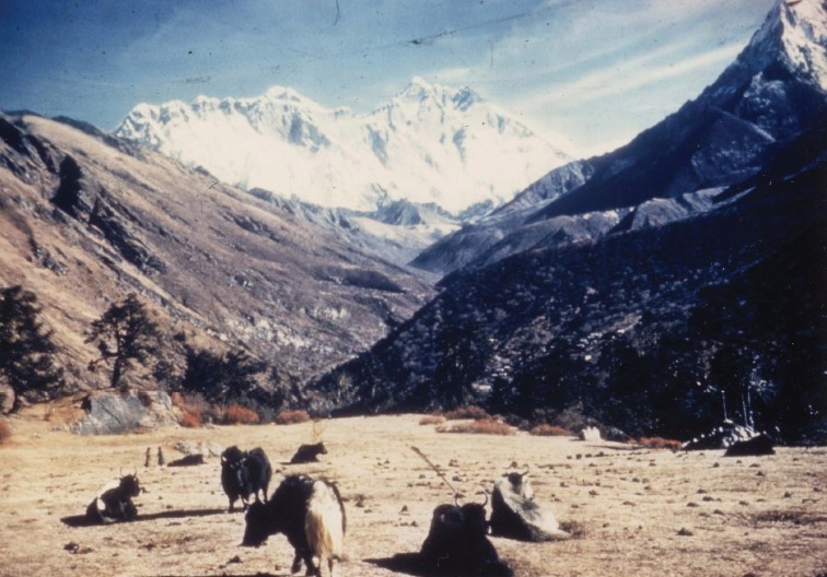 The older photographs that I used included, with permission, those of Namche Bazaar taken by Dr. Charles Houston in 1950, member of the first western group to visit the region in search of a southern route to Mt. Everest. Others include those of Sir John Hunt taken during the 1953 British Everest expedition; by Sir Charles Evans, Deputy Director of the 1953 British expedition; the Austrian climber-cartographer Erwin Schneider’s landscape and glacier panoramas from 1955, taken in the course of making the beautiful Alpenvereinskarte map of the Everest region; the Swiss-Canadian glaciologist Fritz Müller’s photographs of the Khumbu glacier and his Sherpa staff in 1956, following the successful 1956 Swiss Everest expedition; the Austrian geographer and alpine researcher Helmut Heuberger, a member of the successful Austrian Cho-Oyu expedition led by Herbert Tichy in 1954; the New Zealand forester Dr. Nick Ledgard, who since 1989 has assisted The Himalayan Trust and Sir Edmund Hillary Foundation of Canada in their reforestation projects in the Khumbu; New Zealand protected area specialist Bruce Jeffries; and mountain scientist-climber Rodney Garrard. Additionally, several of my own first photographs of the Khumbu region are now “historic” as they were taken in 1973 during my first visit to Nepal, and now provide valuable documentation of the tremendous change brought about from tourism and other factors since that time.