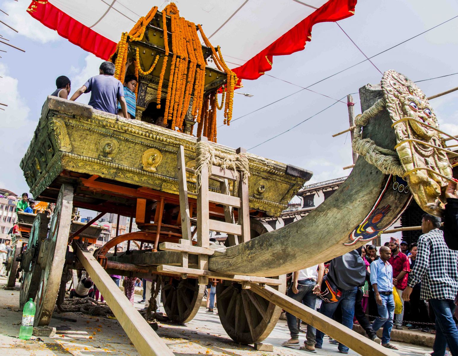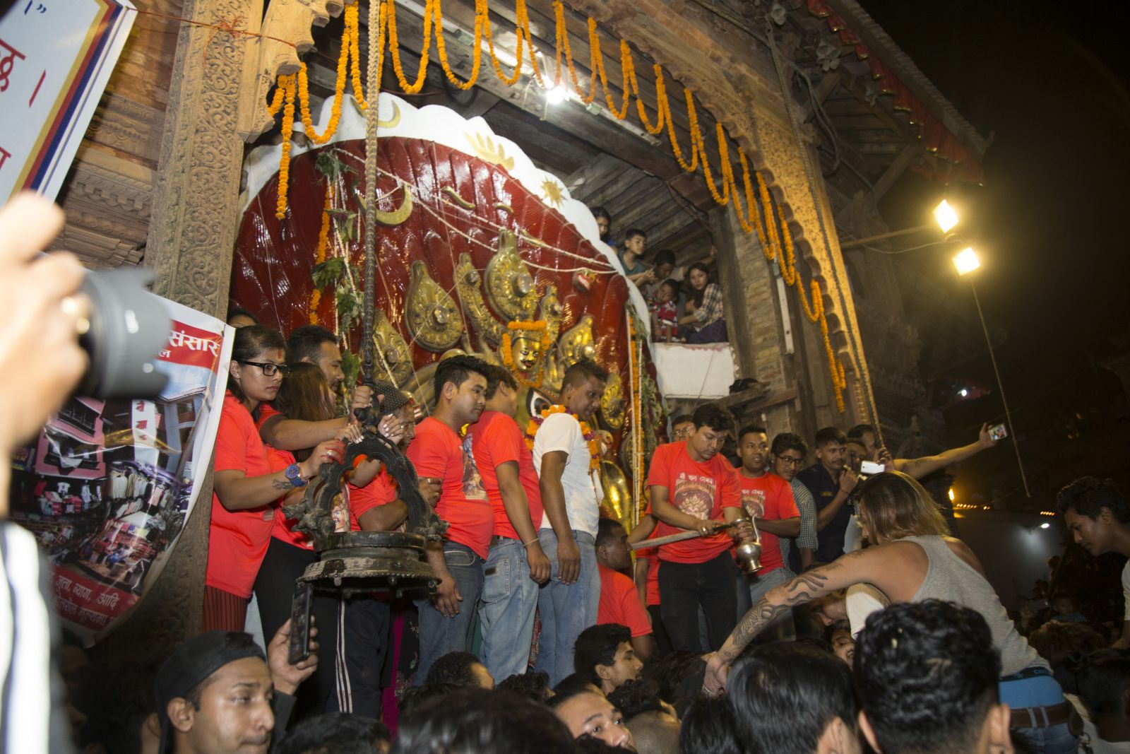 Giant chariots, with massive wheels that can crush all who come in their path, and many times bigger than Arjuna’s or Ramsay’s or Julius Caesar’s; gigantic masks of wrathful tantric gods, fearsome in appearance, and so imbibed with mysticism that that are put on view but once a year; exotic Kumari, the only living goddess in the whole wide world, and before whom even kings and presidents bow their heads humbly with reverence; energetic dances that endow the surroundings with and vigor, and performed as enthusiastically as they have always been since ancient times; a swarming multitude of eager spectators from all around the globe, clicking away like crazy, for it’s a spectacle as is not found anywhere else; Kathmandu Durbar Square, a world heritage site monument, and a living museum at that, now the center of an event so grand, it literally pulsates with excitement for eight days straight.