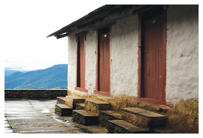 The lodges are built like a traditional hill home using mainly locally available resources and village workmen. The villagers formed community development committees (CDCs) to run the lodges and manage development work in their villages. The Karthali lodge is in a beautiful location just outside the village on a small rise. The whitewashed lodge can be seen intermittently during the last thirty minutes of the trek from Barabhise. All CDC lodges have the same basic design. On the ground floor is a small stone-paved seating area, a kitchen and dining room. A small shop is run with the dual objectives of supplying necessities to villagers at reasonable prices and generating additional income for the lodge. On the first floor is a verandah with wooden railings offering splendid ‘views’ and three rooms with bunk beds offering a total of twenty-six beds to travelers. All lodges have solar electricity, clean toilets, camping grounds and hot showers to wash away the dirt and grime after a long and tiring day.