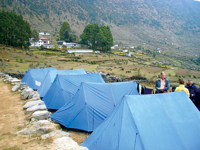 We (Nabin, David Wells and I) were trekking in the Gauri Shankar region, East of Kathmandu during Dashain. We had started from Barabhise, a town on the Arniko highway to Tibet and stayed the first night at the Karthali lodge managed by Sunil and Laxmi Rokha. In the late 1990s Eco Himal, a non-governmental organization based in Austria started developing this region encompassing the northern parts of Sindhupalchowk and Dolakha districts. Water supply schemes, toilet facilities and schools were built and local communities trained in organic farming methods and lodges and campsites constructed at different locations to encourage tourism in this beautiful region.