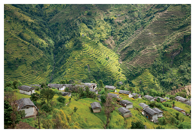 From Loting it is a seven-hour walk to the lodge at Laduk. Laduk (2000m) is rapidly modernizing and has a large bazaar. I was even able to see a shop selling ‘Dish TV’, the direct to home television (DTH) service. The lodge is situated in a beautiful forest of conifers. The initial part of the trek to the Bulung (1900m) is along an unpaved road. After about ten minutes you get your first close views of the twin summits of Gauri Shankar, the holy mountain. The walk is level with splendid views. We soon found ourselves in the village of Orang (1900m) after passing through what has been described among the longest and steepest terraced fields which drop down over 1000 m to the valley floor. The lodge at Orang had a slightly neglected air and is run by a Gurung family who stay a twenty minute steep climb up the hill.