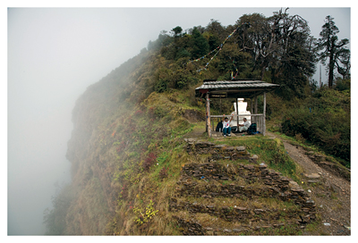 From Dolangsa the trail climbs through a dense forest to the Tingsang pass at 3300 m. My friend, David is into detecting vibrations of living objects and he said the forest gave off very disturbing vibrations. There was a collection of prayer stones and mani walls in the forest may be to counteract the disturbing vibrations. The climb up to the pass is steep and difficult. We were caught in a thunderstorm at the pass and flashes of lightning and the roar of thunder were all around us. We took shelter in a small hut just below the pass on the other side. The trail dropped down slowly and on a previous visit I had good views of Gauri Shankar from the pass.