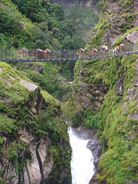 On our return to Namrung we attended yet another inauguration of a monastery. Despite Lakpa’s requests to stay another day, we left Namrung. On the way we met a man leading a goat on a rope towards Namrung. It turned out that he was taking the goat to the monastery for a feast for some journalist guests. We were those guests, we told him. The goat, we were told, was an astonishing 14 years old.